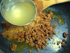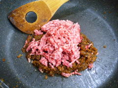追加した人参、セロリなどが飴色まで炒められたら、 挽肉を加えて、全体に火が通るまで軽く炒めます。 |