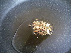 2:キーマカレーを作る フライパンに油とホールスパイスを入れ、弱火でじわじわ加熱する。 (辛いのが好きな方は、ここで少量のホールのとうがらしを加えてください) |