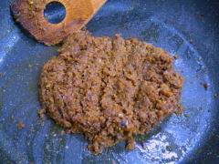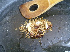 油が熱されて、フツフツと泡立ち、スパイスがはじけて十分に香りがうつったら、 食感が悪いスパイス…シナモン、クローブ、カルダモンの殻をフライパンからよけて取り出します。 |