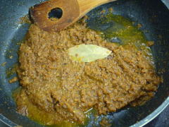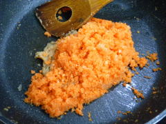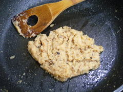 玉ねぎの水気がなくなり、キツネ色になるまで焦がさないように玉ねぎを炒めます。 |