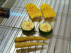 盛り付ける野菜を、順次、調理していきます。 塩分がない素揚げした野菜には、少量の塩をふりかけます。 |