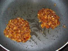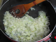 2:玉ねぎペーストを作る フライパンに油をひいて、材料Bのみじん切りにした玉ねぎだけを単体で炒める。 |