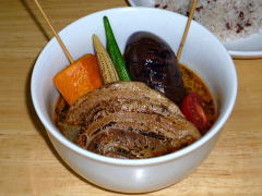 【材料】3~4人用 前日に作って、冷蔵庫で一晩寝かせるとおいしくなります。 A:リンゴペースト リンゴ(1/2個)、生姜(1片)、ニンニク(3片)、食用油脂(適宜) B:玉ねぎペースト 玉ねぎ中2個(400g)、食用油脂(適宜) C:スープ材料 鶏ガラ(1羽)、トマトピューレ(3倍濃縮:30g)、リンゴ(1/2)、ショウガ(少々)、ニンニク(1片)、 昆布(10g)、日本酒(30cc)、長ネギ(青い部分) D:仕上げ調理用(1100cc程度に対し) バジル(ひとつまみ)、醤油(大さじ2)、ナンプラー(大さじ1)、粉末かつおだし(大さじ1) パウダースパイス(大さじ1)、カイエンペッパー(お好みで)、ガラムマサラ(少々)、ココナッツミルクパウダー ↑ クミン、コリアンダーを1:1に配合したもの E:具材(※今回は炙り角煮をメインにします。お好みでOKです) 豚角煮{豚バラ肉(500g)、長ネギ(青い部分)、ショウガ(2片)、醤油、砂糖} 人参、じゃがいも、ヤングコーン、なす、ミニトマト、オクラなどお好みで。 竹串も忘れずに。今回はお米は赤米を1割弱混ぜて炊飯しています。 |