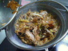 時間になったら、火を止め、減圧してフタをあけます。 アクが浮いていれば、軽くふき取ります。 木べらで鶏ガラや具材をつぶしながら、さらに10分程度煮込みます。 |