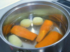 じゃがいも、にんじんはやわらかくなるまでボイルしておきます。 つまようじで刺して、すっと通るようであれば、OKです。 串打ちをしやすように、気持ち固めに仕上げます。 |
