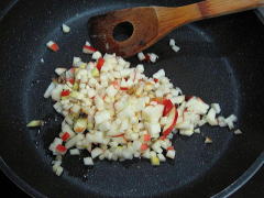 【作り方】 1:リンゴペーストを作る 材料Aのリンゴ、ショウガ、ニンニクのそれぞれをみじん切りにして、油をひいたフライパンで炒める。 |