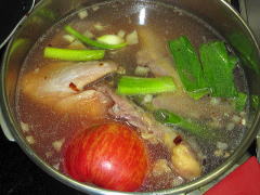 3:スープ作り Cのスープ材料すべて、1で作ったリンゴペースト、2で作った玉ねぎペーストの半分を 圧力鍋に投入し、2000cc程度の水を加えて点火。 圧力がかかったら、1時間程度、加圧状態で煮込みます。 |
