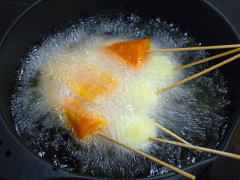串打ちした野菜は、170~180℃に熱した油で素揚げします。 人参も揚げてしまって大丈夫です。 |