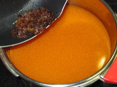 スープの調整が終わったら、2の玉ねぎペーストの残り半分をスープに投入します。 この玉ねぎは濾さずに最後までスープに入ります。 スープにとろみがつくのが嫌でなければ、スープに入れてしまう玉ねぎの割合を増やしてもOKです。 ひと煮立ちさせながら、 完成スープ量が1100cc程度になるように調節します。 (※やや煮詰まったものを水で希釈する方が調整しやすいと思います。) |